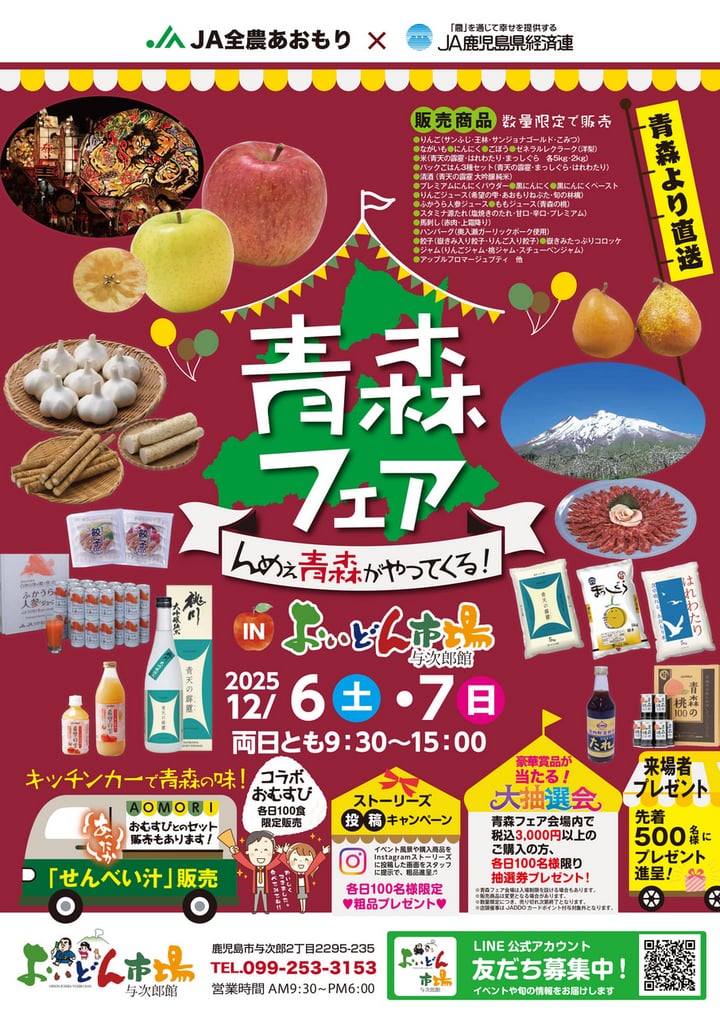 令和7年12月6日(土)・7日(日)の2日間、おいどん市場与次郎館にて、JA全農あおもり×JA鹿児島県経済連コラボイベント「青森フェア㏌おいどん市場与次郎館」を開催いたします。