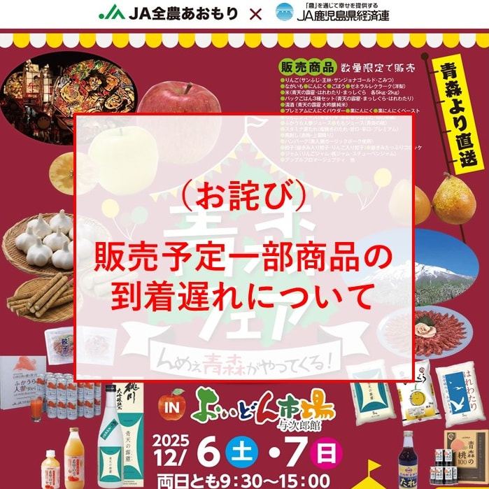 令和7年12月6日(土)~7日(日)おいどん市場与次郎館にて開催いたします「青森フェアinおいどん市場与次郎館」につきまして、降雪の影響により、一部商品到着遅れのご報告をいたします。