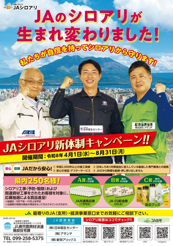 令和8年4月1日(水)~8月31日(月)まで、『JAシロアリ新体制キャンペーン』を実施いたします。