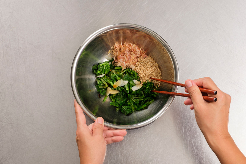 所要時間 30分 あきほなみの塩むすび 1 2 4 5 6 材料(3人分) おにぎり 米(あきほなみ) 2合 水 300cc 氷 6個 塩 適量 金ごま 適量 焼き海苔 適量 大根葉の鰹節和え 大根葉 適量 鰹節 適量 金ごま 適量 カブの漬物 カブ 適量 塩 適量 みかんの皮 適量 作り方 1 米(あきほなみ)を洗って20〜30分浸水しておく。(無洗米でない場合は洗ってから浸水してください) 2 氷を入れて炊き上げる。鍋だきの場合は、土鍋を強火にかけて10分ほどすると湯気が出るので火を止めて10分蒸らす。(蒸らしが長いと、ご飯が硬くなります) 3 米を炊き上げる間に「大根葉の鰹節和え」「カブの漬物」を作る 4 カブを食べやすいサイズに切り、塩をまぶして揉み込む。(好みでみかんの皮の薄切りなどを混ぜても美味しいです) 5 大根葉をさっと茹でて、しっかり絞り1センチ幅に刻む。鰹節と金ごまをお好みで入れて、醤油でさっと合える 6 米が炊き上がったら粗熱をとり、おにぎりにして塩とごま、焼き海苔を巻いて出来上がり。 ワンポイントアドバイス 米は氷を入れて炊くと、お米が一粒ずつしっかり立つ感じでツヤツヤに炊き上がります!炊飯器でも使えるワザなのでぜひお試しください! このレシピが関連するカテゴリ 和食 米 葉物野菜