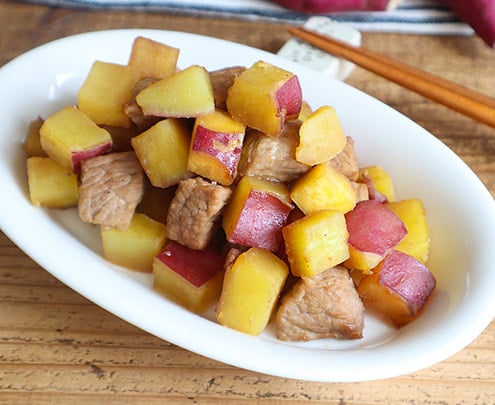 所要時間 20分 さつまいもと豚肉のコロコロステーキ 材料(2人分) さつまいも 1本(300g) 豚もも肉(かたまり) 300g 酒 大さじ2 醤油 大さじ1 みりん 大さじ1 バター 8g 作り方 1 さつまいもは皮つきのままよく洗い、2cm角に切って水にさらす。 2 豚肉は2cm角に切り、塩とこしょう各少々(分量外)をする。 3 油適量を中火で熱し、1と2に焼き目をつけるように炒め、酒をふって蓋をする。火が通ったら蓋をとって汁気を飛ばし、醤油・みりんを加えて混ぜ、バターを加えてからめたら出来上がり♪ 出展元:◆JA鹿児島県経済連 野菜振興課◆ このレシピが関連するカテゴリ 洋食 肉 いも類・根菜類